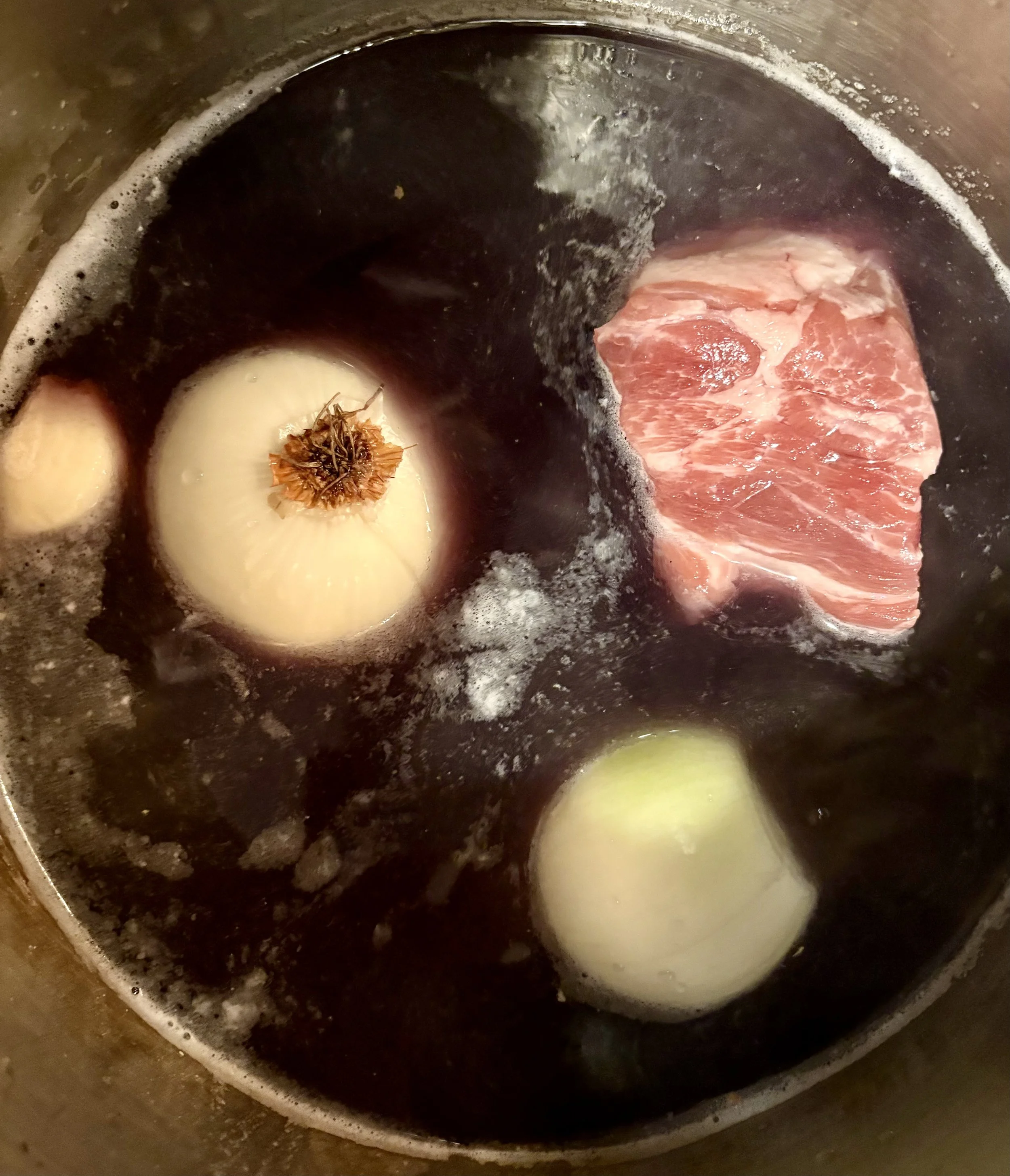 Add beans, a whole peeled onion, and frozen pork to a pressure cooker. Cover with water about 2 inches above the beans. Add a whole garlic clove if desired.