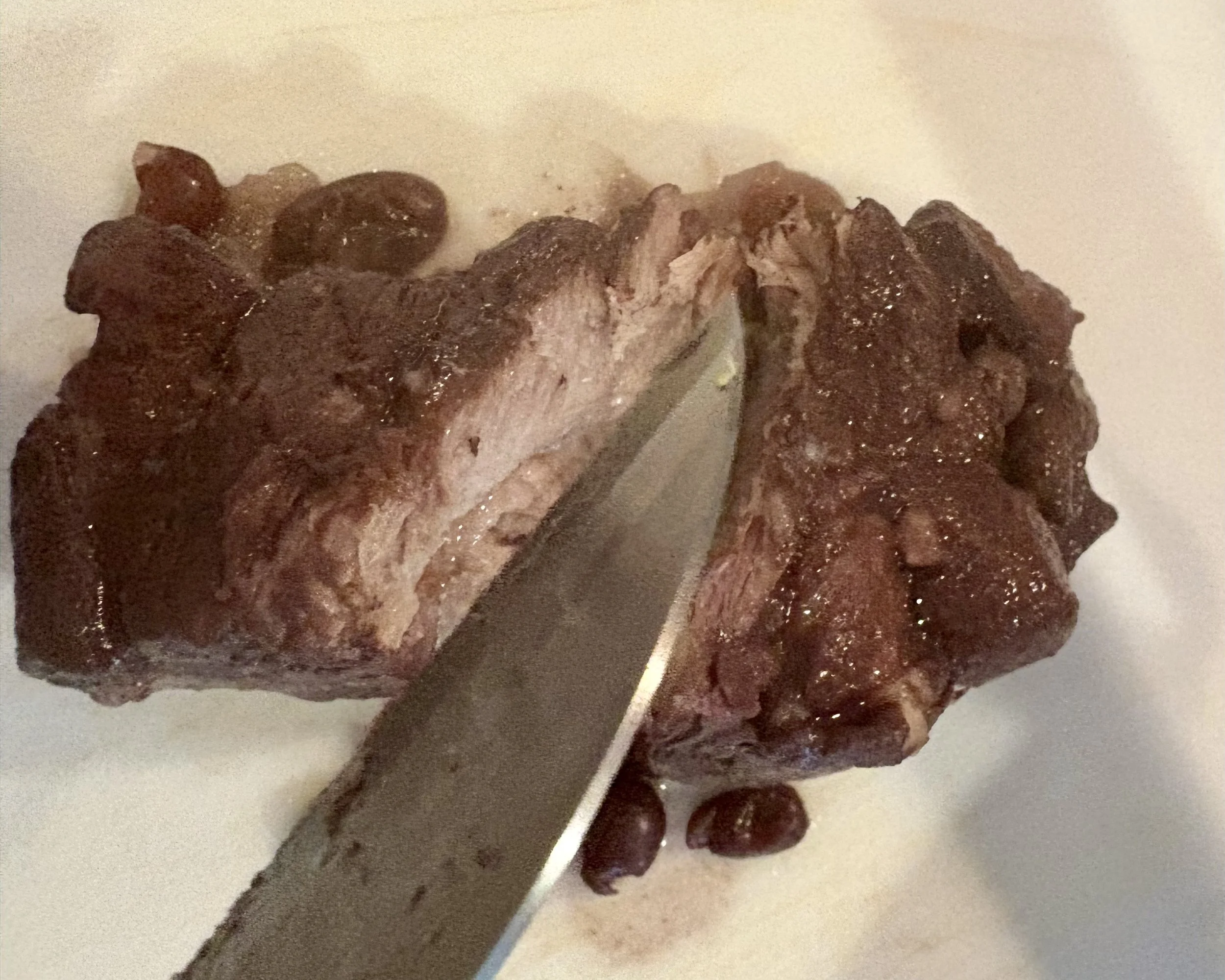 Bring the pressure cooker to pressure and cook for 20 minutes. Turn off the heat and let it sit, locked, for 45 minutes. Remove the lid. Discard the onion and garlic. Add salt and pepper. Remove, chop, and return the pork if you like. If the beans are too liquid, simmer them uncovered to reduce the liquid. Beans will thicken as they cool.
