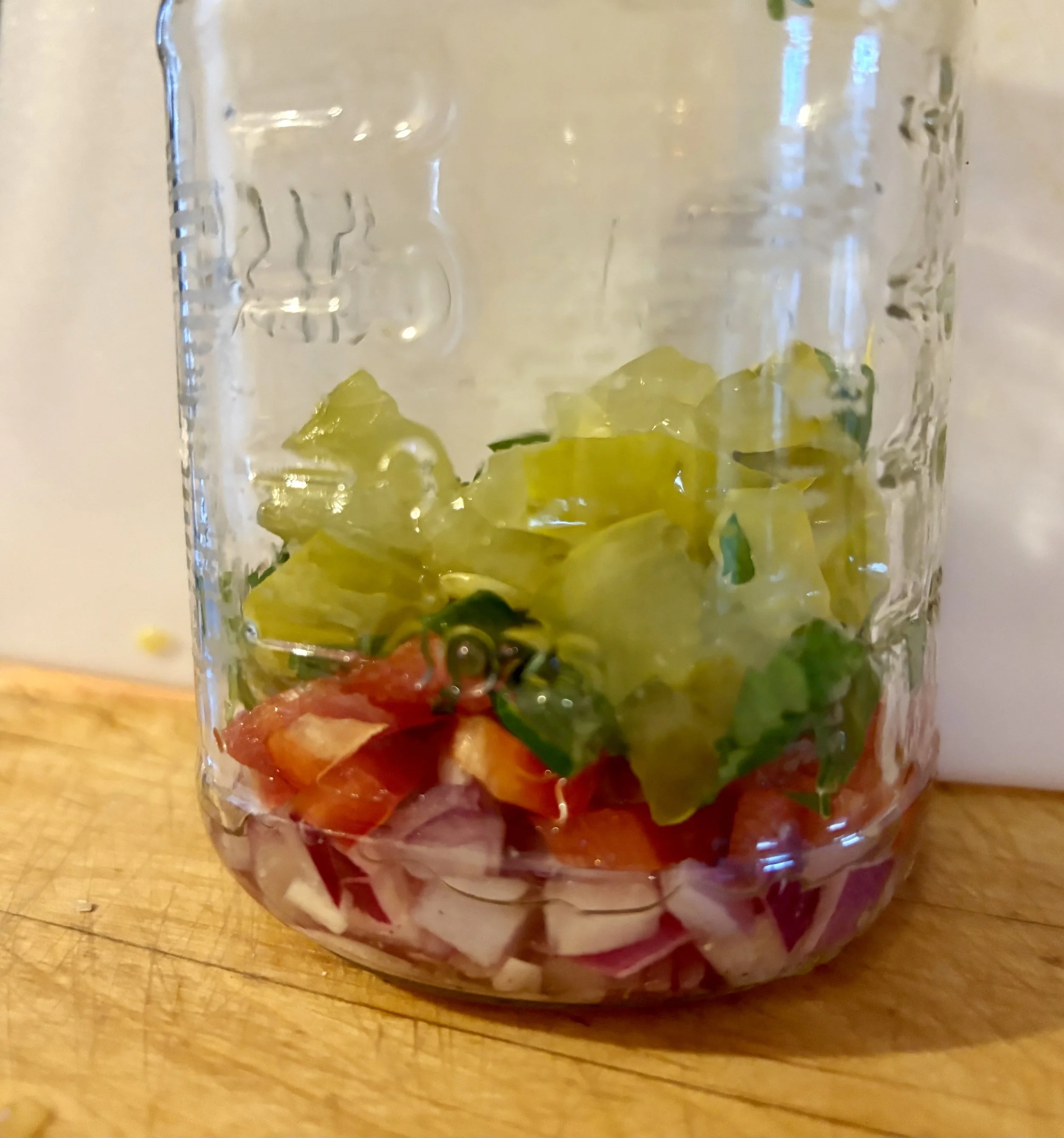 This time, we chose red onion, red pepper, pickles, salt, pepper, fresh parsley, and vinegar. We stored it in a glass jar.