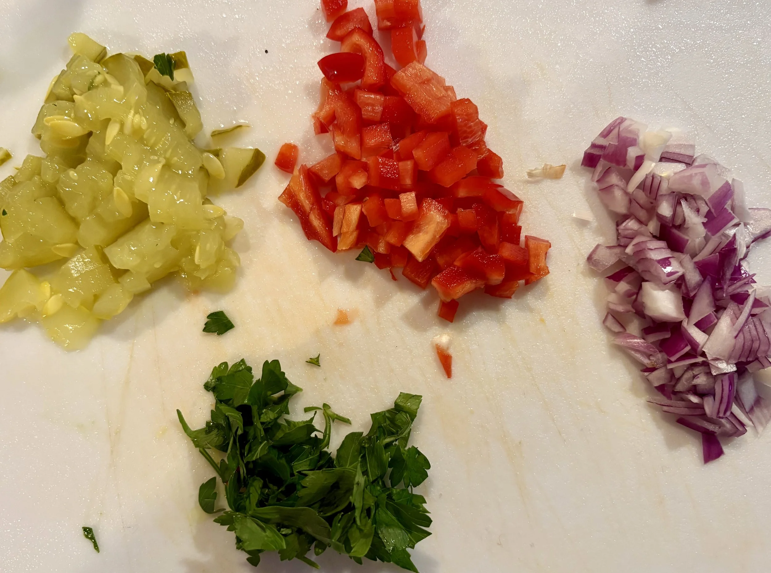 The salsa or relish depends on what you have. Include salt, pepper, minced allium, vinegar, and a fresh herb. You might add citrus juice, cilantro, or jalapeno. Pickles and tomatoes are good too. Keep the salsa simple and balanced; avoid too many ingredients.