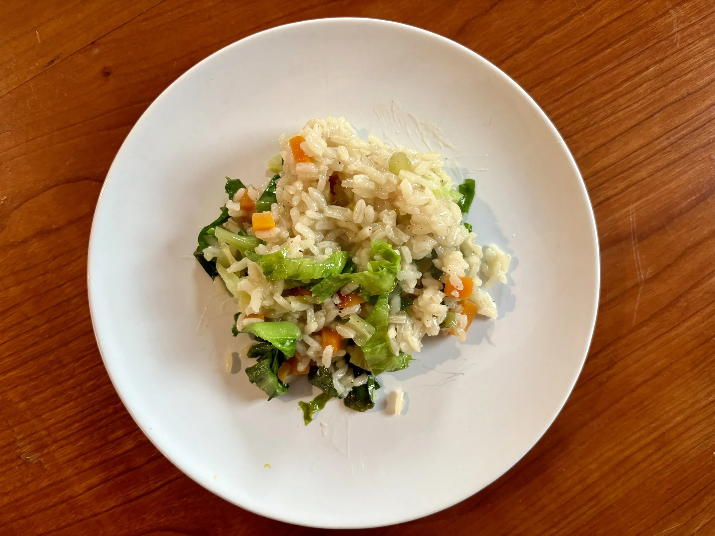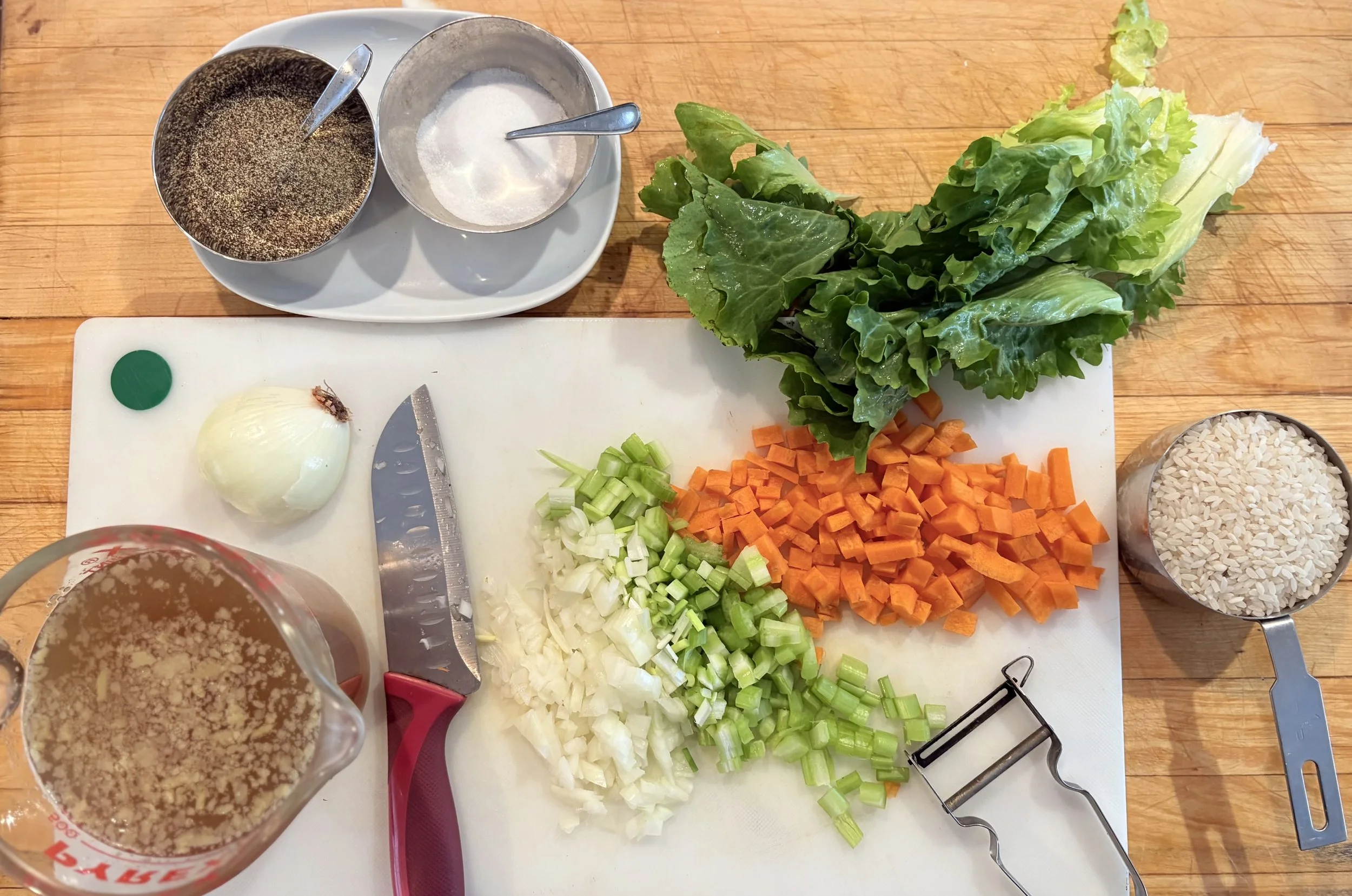 We created this easy dish to utilize the homemade chicken stock we had in the refrigerator, rather than freezing it. This rice is basic but foundational. By adding extra vegetables, we created a healthier, more vibrant, and crunchier result. The neutral flavor pairs well with a variety of proteins.
