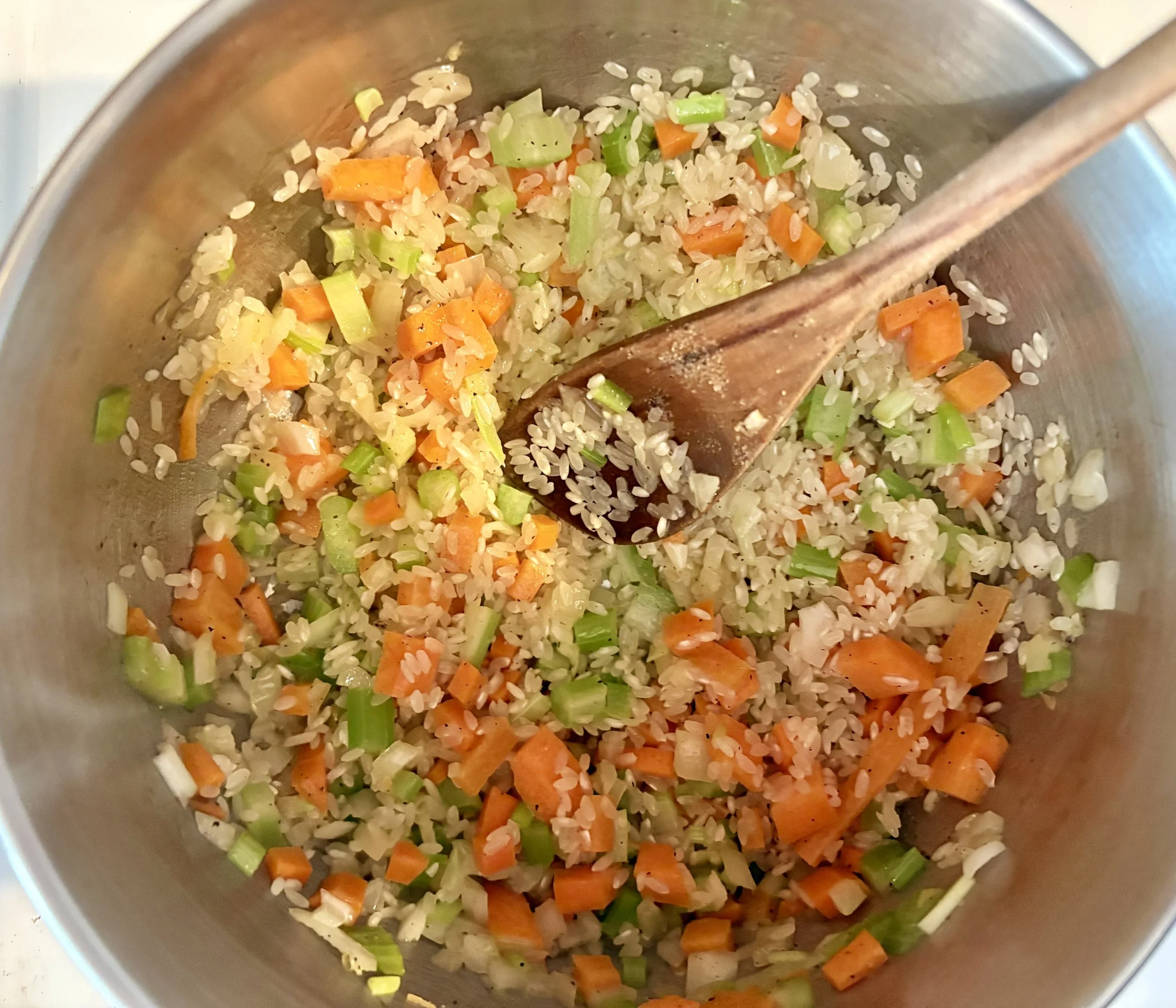 First, create a mirepoix by sautéing onions, carrots, and celery in butter over low heat until the onions are translucent. We also added green onions we had on hand. Once the vegetables are translucent, add the rice. Remember to use a 1:2 ratio of rice to liquid.