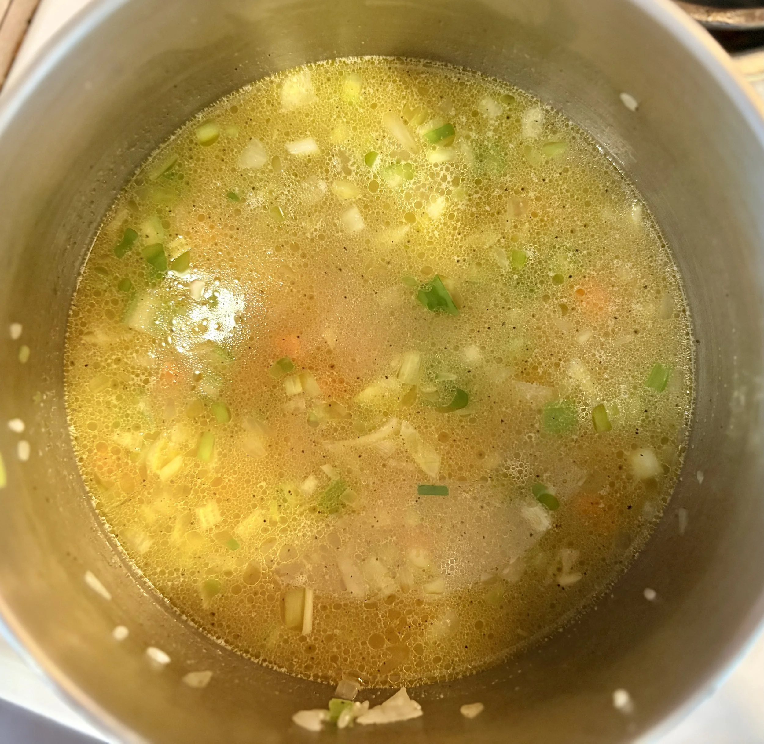Next, add 1 cup of medium-grain rice along with salt and pepper, and continue cooking on low. Any variation of rice can be used.