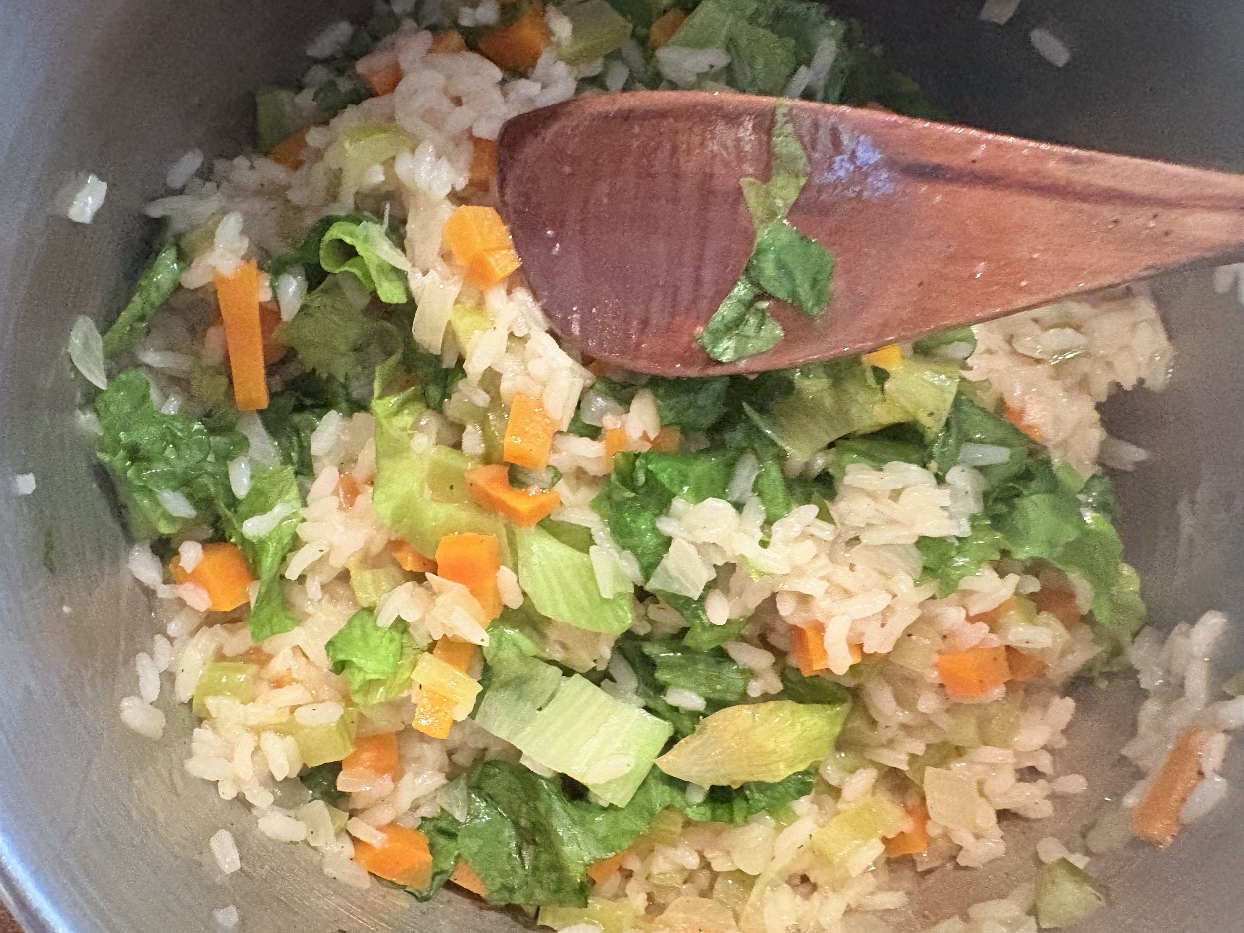 After 20 minutes, check the rice for doneness. If cooked, add the escarole, cover, and remove from the heat. The escarole will wilt in the pot within 3 minutes.